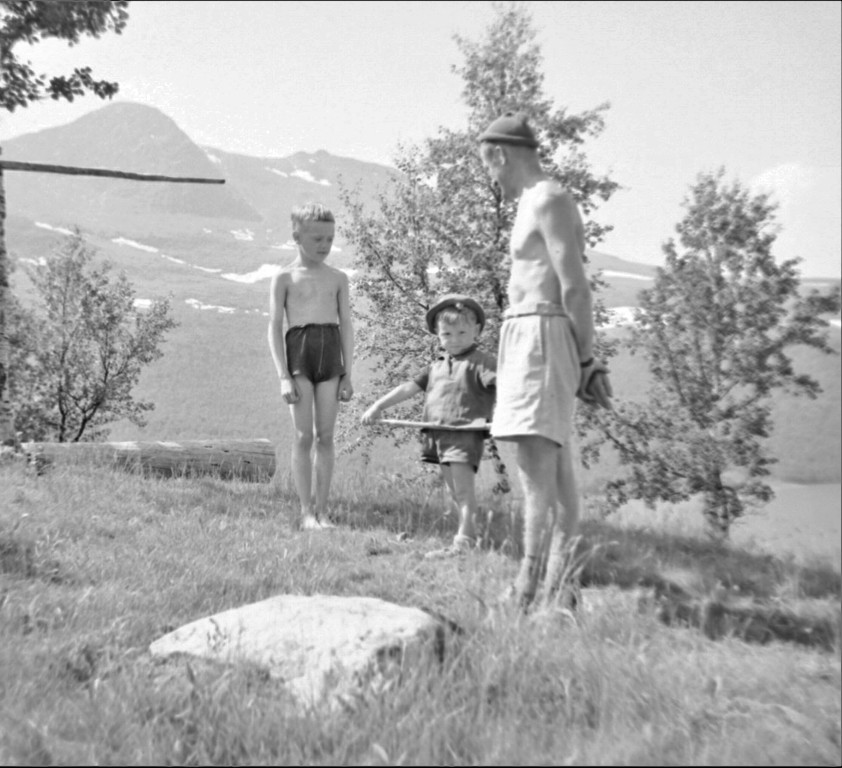 Bilden tagen av Kjell Fjällström 1954. På bilden syns Linder Alfredsson med sonen Erik. Dan Fjällström står i mitten.